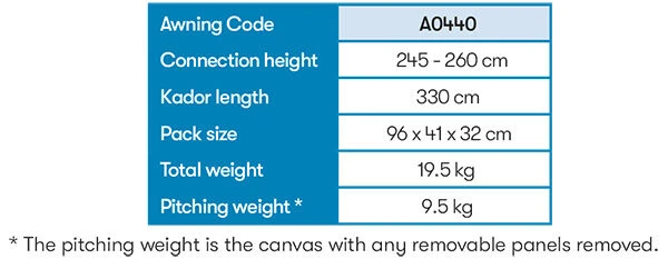 The Westfield Mars 330 is a modern luxury porch awning made with a quality newly developed Ripstop polyester fabric, designed to withstand the elements, giving you an area of 330 x 250cm to use as an extra outdoor room, storage or with the purchase of an inner a great bedroom space. It has been designed specifically for motorhomes with a sliding doors but will work with so many more! It has a unique centre beam that sits higher than the other others to allow the use of the sliding door, but also offers better door clearance as well
