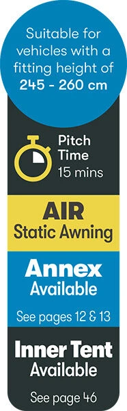 The air frame has been made with a single point inflation for quick pitching but in the unlikely case that you do run into problems you can re inflate each beam separately or remove a single tube on site if needing to repair or replace – the added benefit of air tubes is for quicker pitching and sturdier in adverse weather; The Vega 330 comes with super beams which aids to the strength and durability as the beams are less likely to bend and flex than smaller beams
